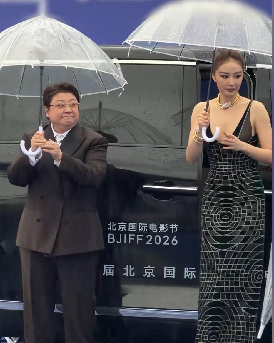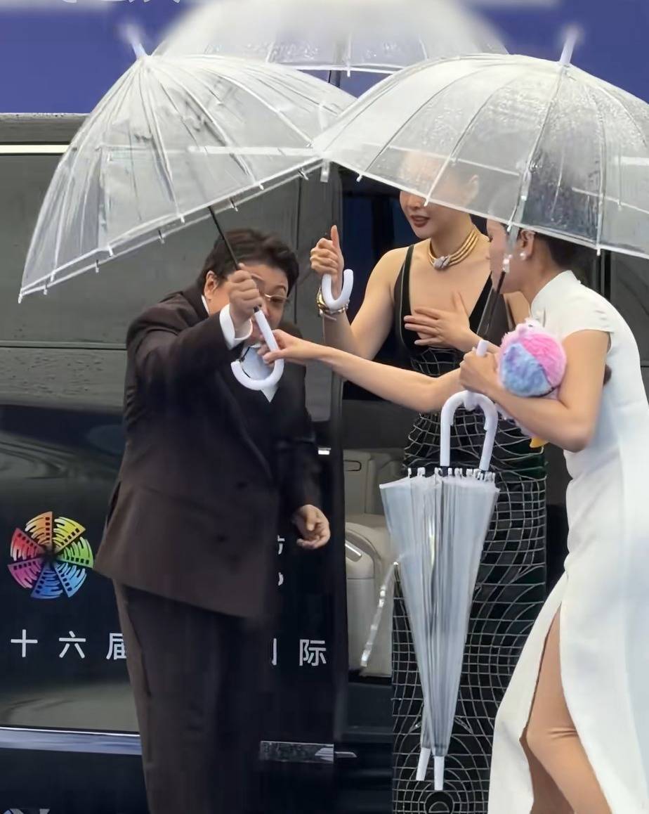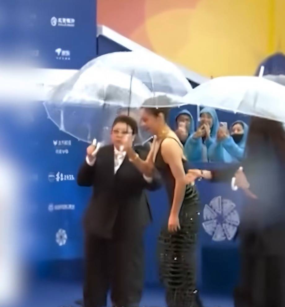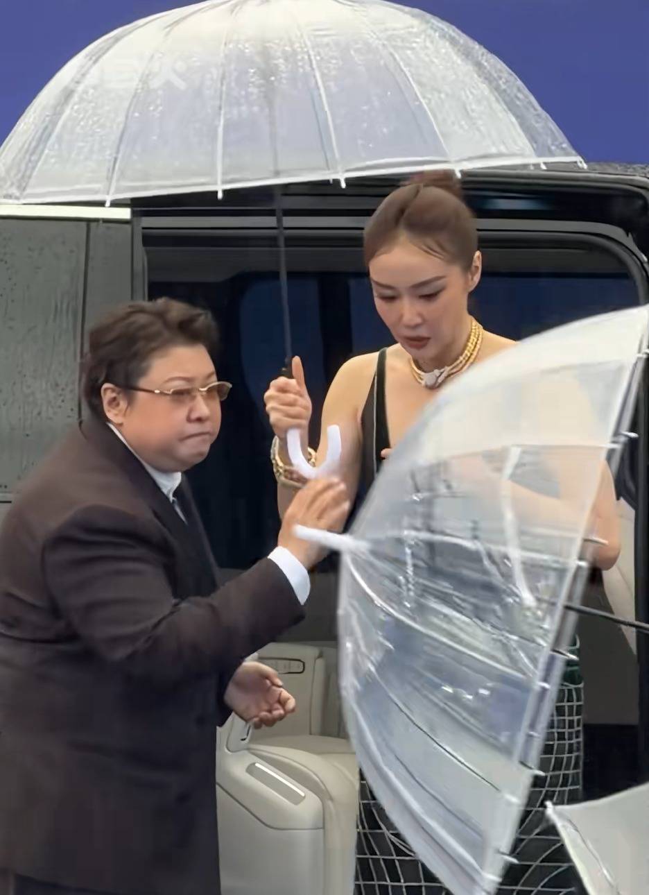 于是,出现了平日里红毯上难得一见的场景:身着高定礼服、化着精致妆容的女明星们纷纷撑起雨伞,有人提起裙子却顾不上雨伞,模样略显狼狈。