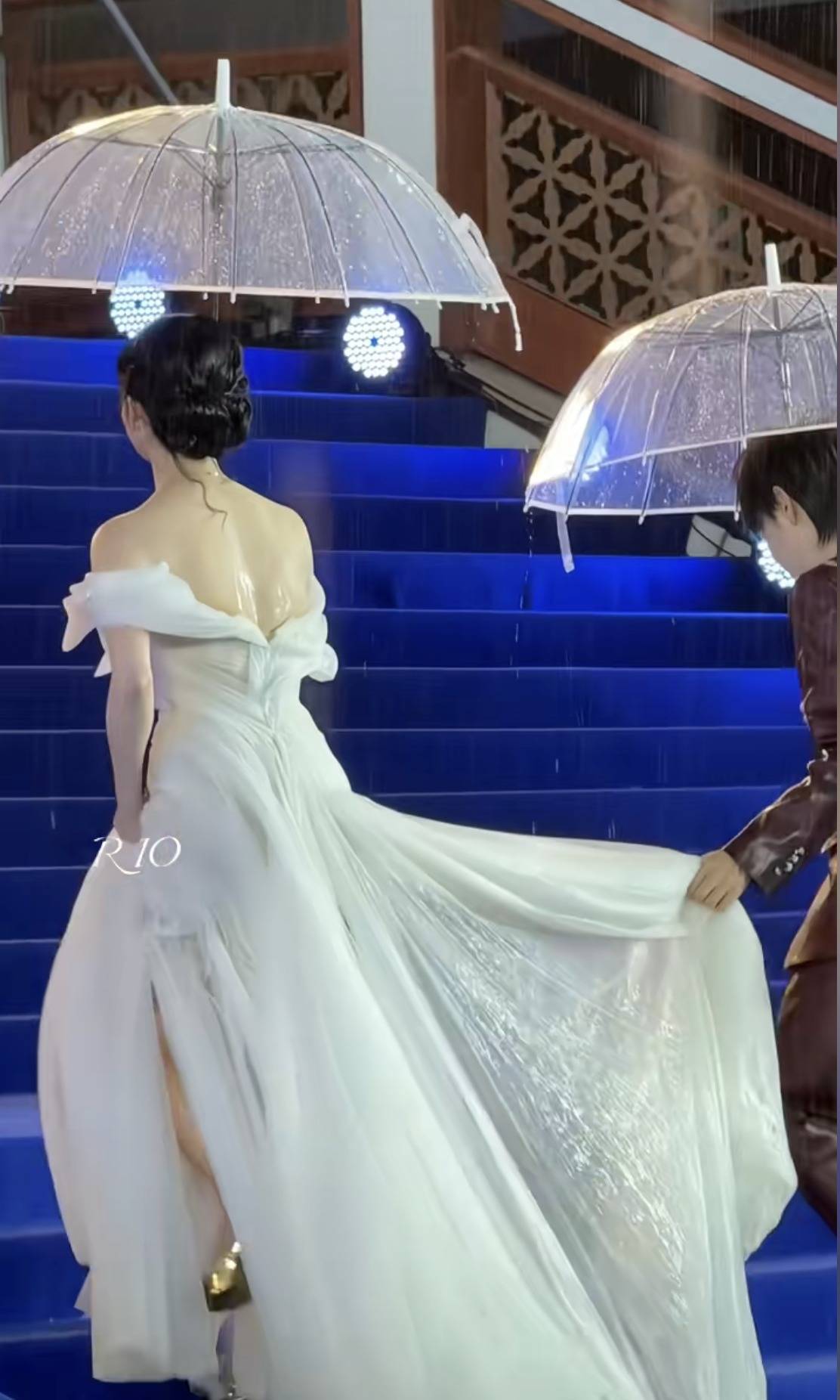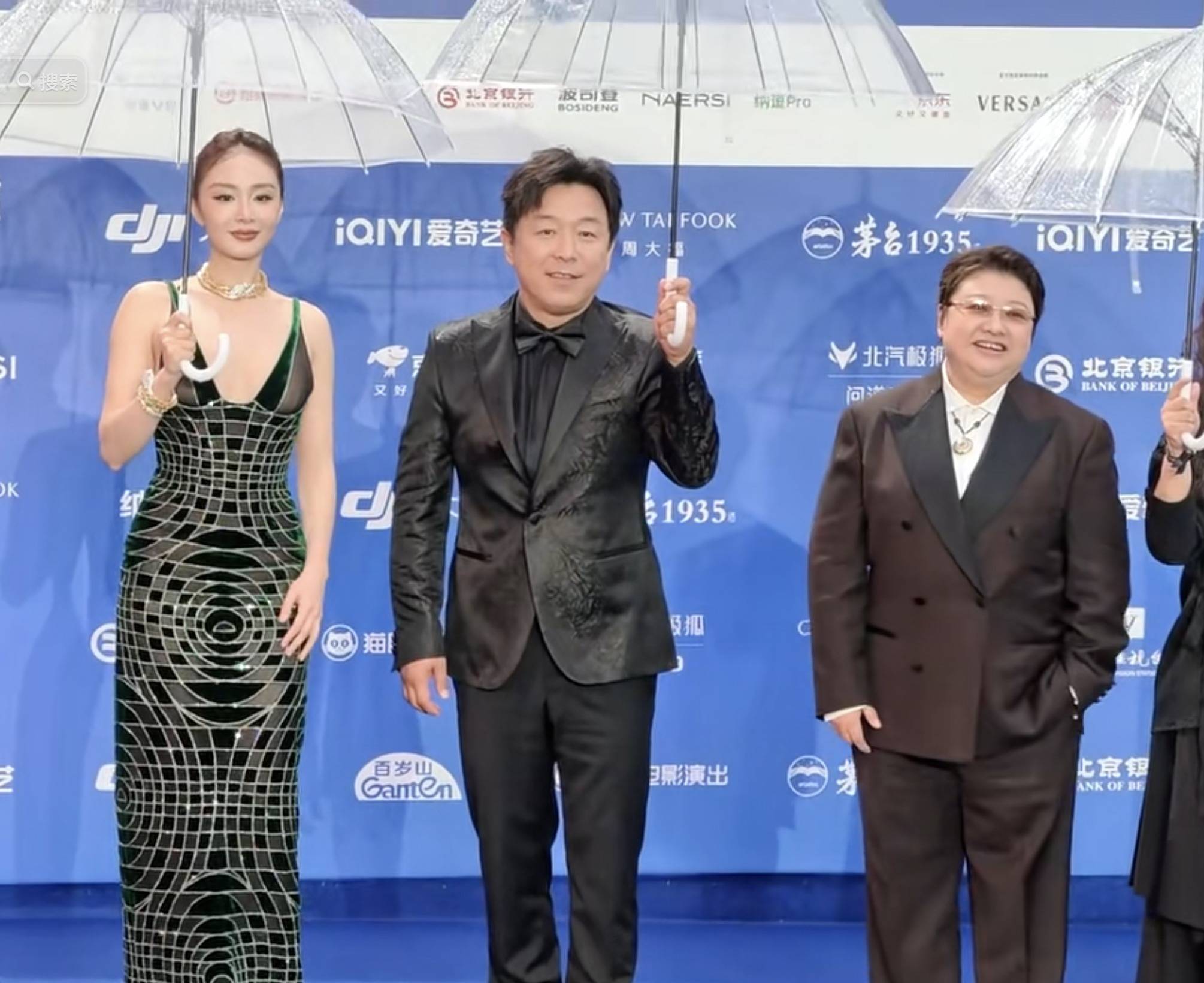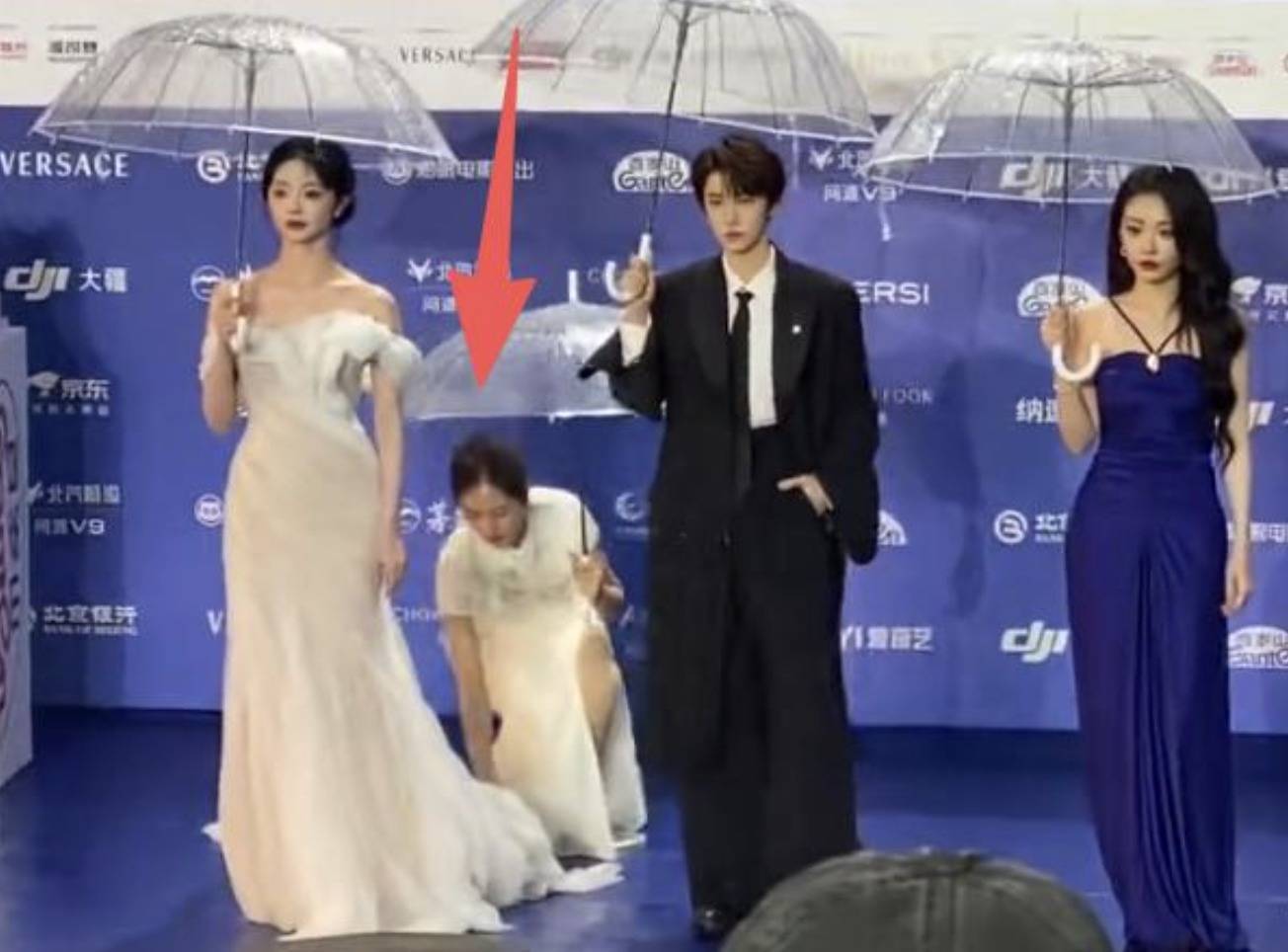 于是,出现了平日里红毯上难得一见的场景:身着高定礼服、化着精致妆容的女明星们纷纷撑起雨伞,有人提起裙子却顾不上雨伞,模样略显狼狈。
