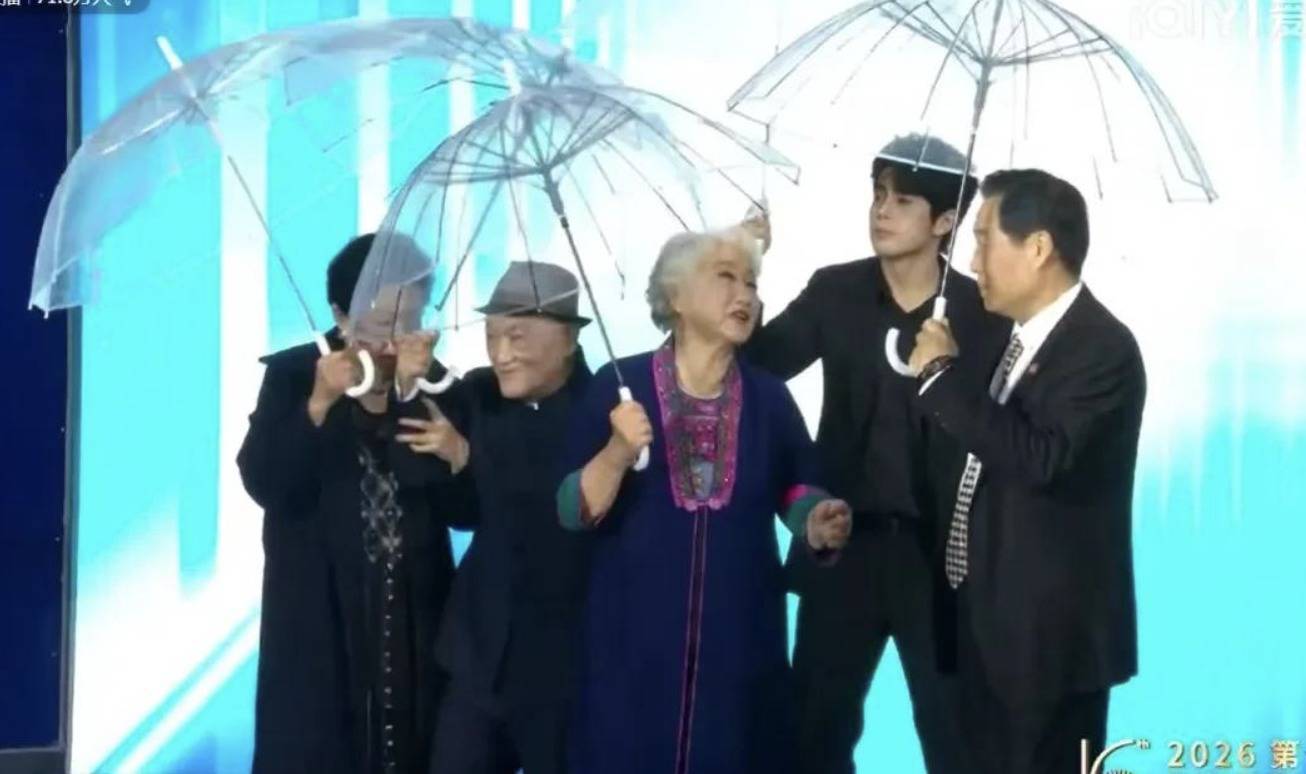 像牛犇、斯琴高娃,一个90岁,一个76岁,在大雨倾盆的日子里也得登场,且没有工作人员给予特殊照顾。