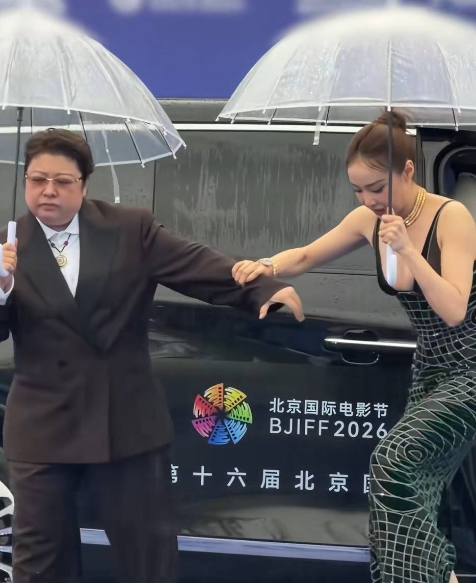 高叶身着紧身连衣裙,脚踩细高跟,雨天下车本就极为不便。韩红的贴心搀扶,细节之处尽显温柔与体贴。